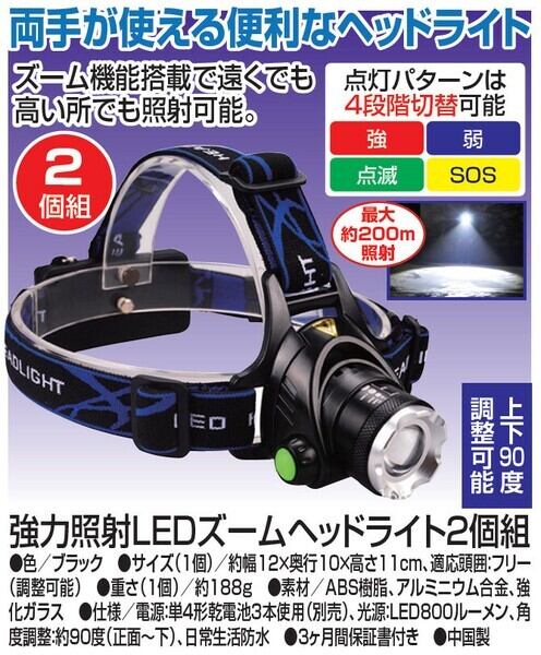 強力照射LEDズームヘッドライト2個組