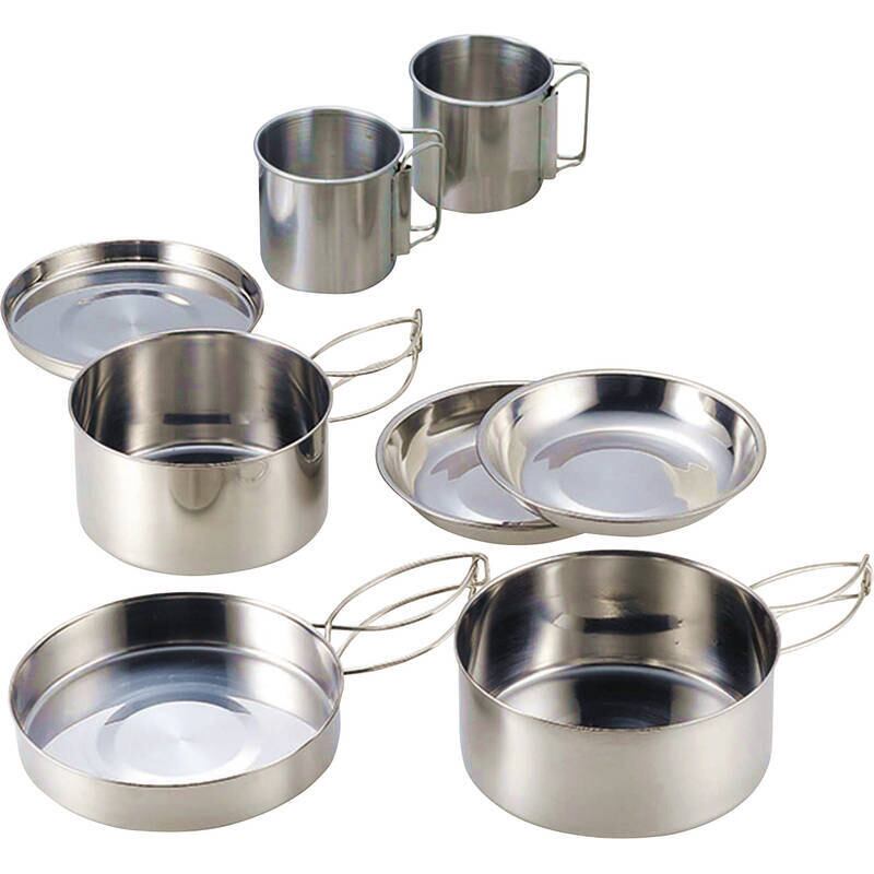 鍋大:144×245×64mm・1L、鍋小:123×222×65mm・0.7L、フタ兼用フライパン:148×255×30mm、フタ兼用皿:φ130mm×各1、小皿:φ136mm、マグカップ:270mL×各2、携帯袋