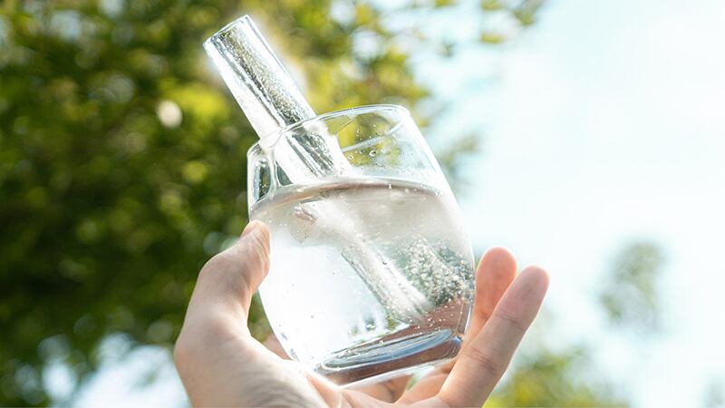 Step1.水やジューズなどを約2/3まで容器に入れからスティックを穴に差し込む