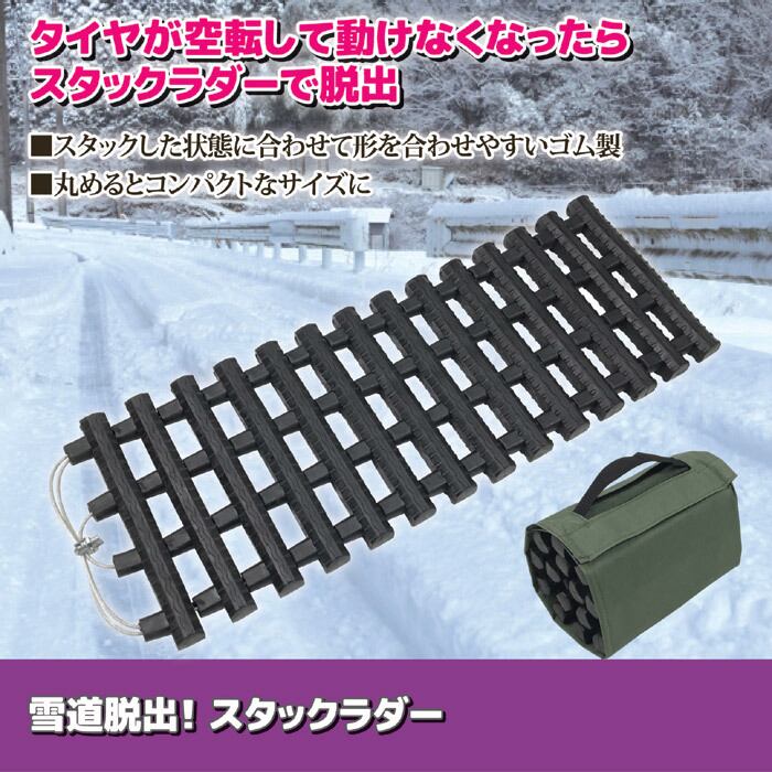雪道や砂地、ぬかるんだ道路などで起こる自動車のタイヤスタック(タイヤの空転)に対応するための脱出用具です。このゴム製のスタックラダーを空転してしまうタイヤの地面側に差し込んで使用します。表面がゴム製なのでタイヤに噛みやすくなってます。また、丸めたり広げたりと形を変化させることで、スタックしている状況に合わせてセットすることができます。使用しない時は丸めてコンパクトな大きさになるので、トランクの中などに収納しておいてください。